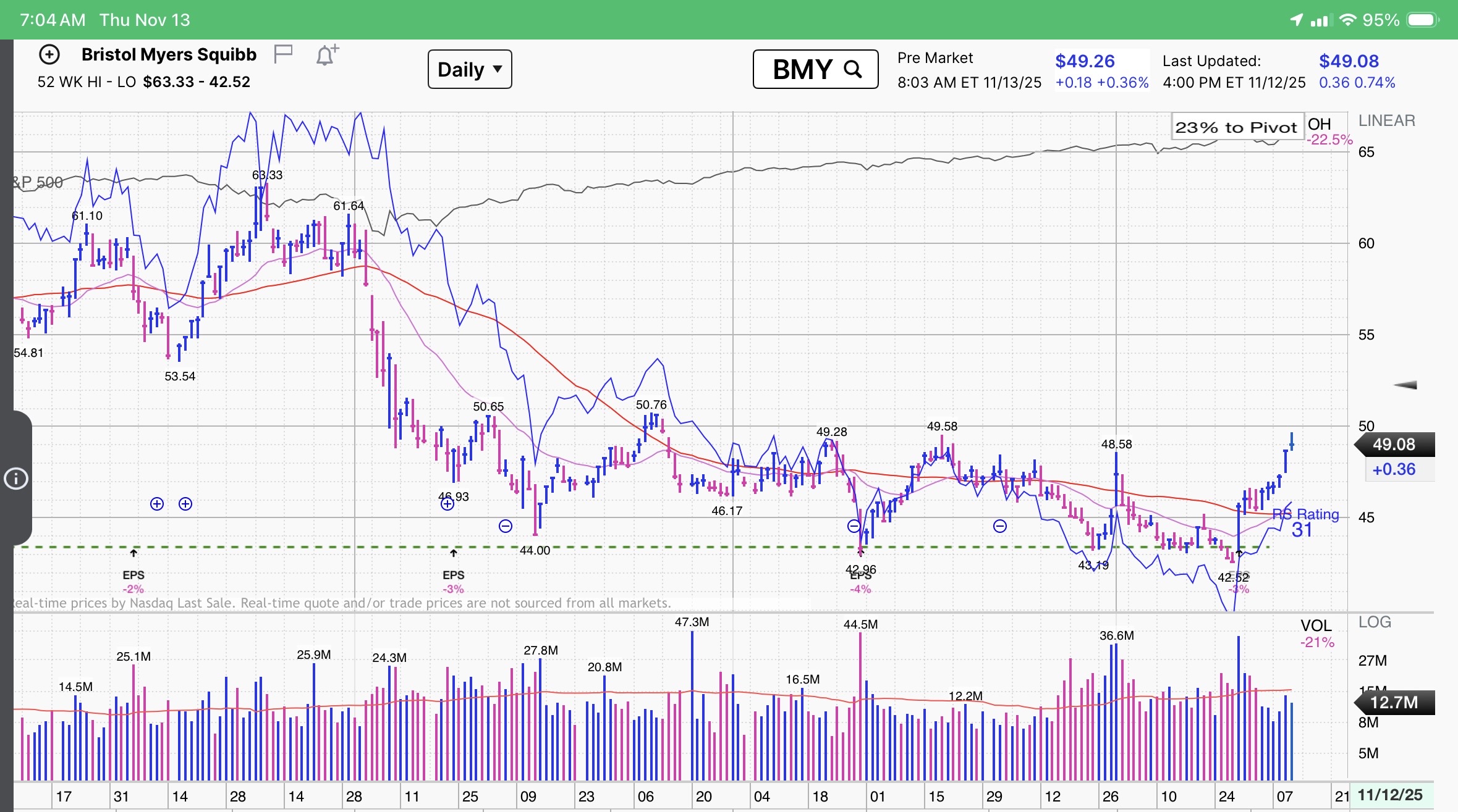 BMY looks good here….Markets showing rotation into health care….recently posted on LLY, and ISRG, which are working.